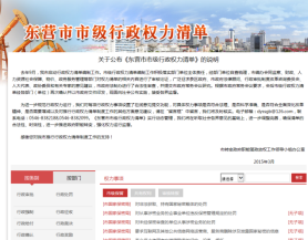 二是推進(jìn)行政權(quán)力清單信息公開。2015年3月,市政府公布市級(jí)行政權(quán)力清單,并通過政府網(wǎng)站和編辦網(wǎng)站建立了“行政權(quán)力清單公示平臺(tái)”,公開權(quán)力事項(xiàng)的名稱、法律依據(jù)、實(shí)施主體、運(yùn)行流程、監(jiān)督方式等要素,接受社會(huì)監(jiān)督。2016年4月,印發(fā)了《關(guān)于調(diào)整東營(yíng)市市級(jí)行政權(quán)力清單有關(guān)事項(xiàng)的通知》(東政字〔2016〕28號(hào)),對(duì)32個(gè)市級(jí)部門單位、559項(xiàng)行政權(quán)力事項(xiàng)予以調(diào)整,并及時(shí)做好了權(quán)力清單公示平臺(tái)相關(guān)事項(xiàng)要素的調(diào)整公示工作。三是落實(shí)政府責(zé)任清單信息公開。及時(shí)公開《東營(yíng)市人民政府關(guān)于公布市級(jí)政府部門責(zé)任清單有關(guān)事宜的通知》(東政字﹝2015﹞26號(hào)),全面推進(jìn)市、縣區(qū)政府部門責(zé)任清單編制工作。截至2015年底,市縣兩級(jí)政府部門責(zé)任清單均編制完成,并通過本級(jí)政府網(wǎng)站和機(jī)構(gòu)編制部門網(wǎng)站向社會(huì)公布。
