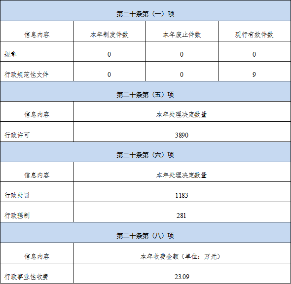 3.本機關人大代表建議和政協提案辦理結果公開情況:2023年度本機關共收到人大代表建議19件,其中應公開6件;省政協委員提案19件,其中應公開8件。所有建議提案已全部辦結并按時限要求答復,建議提案反饋率、辦結率、代表委員滿意率均為100%,并通過門戶網站發布2023年人大代表建議和政協提案總體辦理情況。